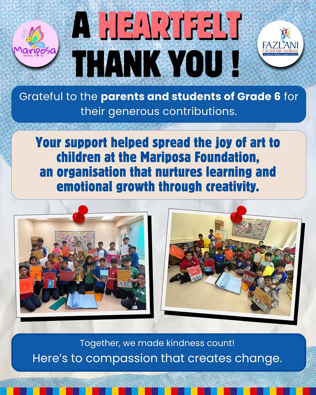 Students of Grade 6 collected art supplies and basic stationery items, which were donated to the children at the Mariposa Foundation. The Mariposa Foundation supports children with special challenges, reaching out to those with single or multiple disabilities, and helping them lead lives of dignity and respect.
